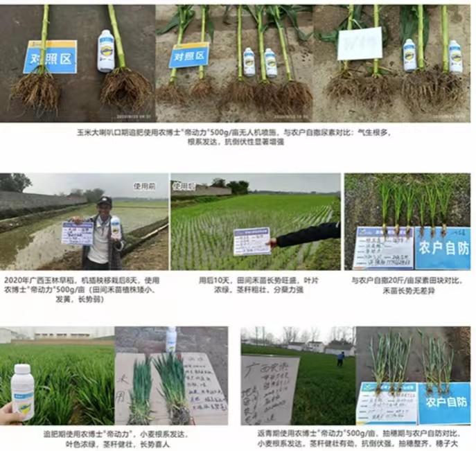 - 产品差异化性质:可用干无人机喷施,高浓度低水量下(1:1稀释)。对作物安全;叶面喷施易吸收,利用率高,快速补充作物氮元素,促进作物生长发育;缓释长效,持效期长达45天;可混配农博士水田除草剂喷施,省工高效。